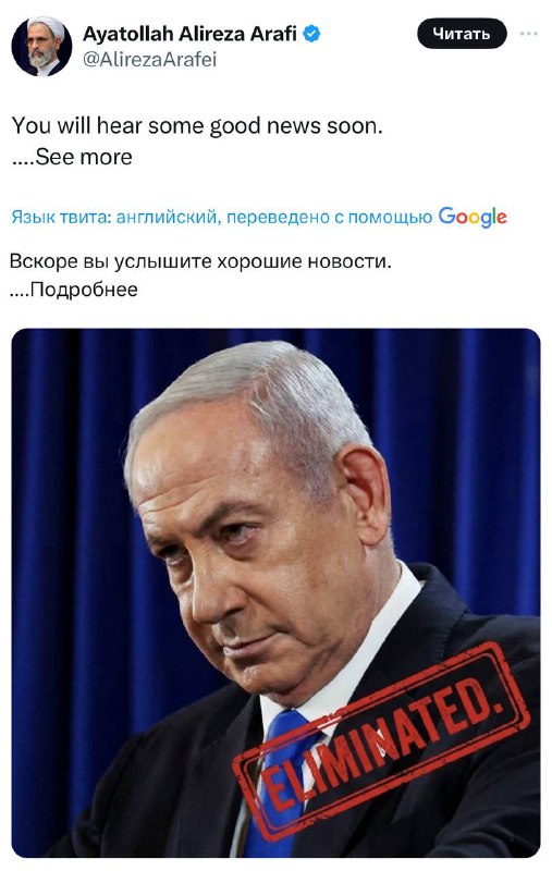 Исполняющий обязанности Верховного лидера Ирана заявил что скоро будут «хорошие новости» по Нетаньяху и «сегодня высокомерию сионистов придет конец». Наблюдаем 🍿 немного подуло