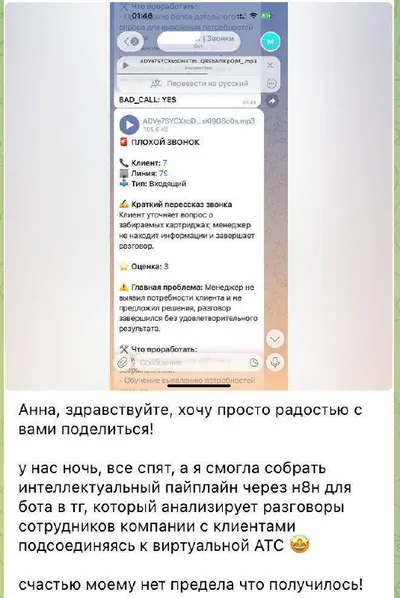 Знаете, сколько времени нужно на анализ звонка, если вы исполнитель? А сколько нужно заплатить человеку, если вы собственник? 🙈 Посмотрите на скрин: за несколько часов вы можете собрать бота, которы