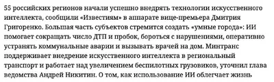 55 регионов России уже внедряют ИИ Умные города, беспилотные грузовики, автоматическое управление пробками — всё это не планы на будущее, а то, что происходит прямо сейчас. Эта новость подсвечива