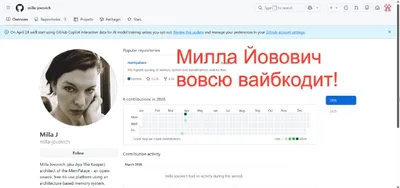 Милла Йовович программирует с помощью ИИ и уже выложила код на GitHub Вчера подписчик скинул мне ссылку на GitHub Миллы Йовович. Да, той самой, из «Обители зла». У актрисы теперь есть свой аккаунт на
