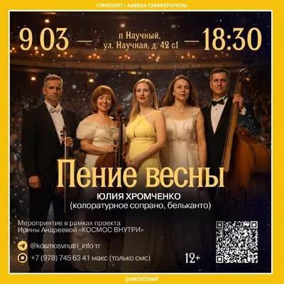 🕊️ Концерт "Пение весны" 📍 Научный, Бахчисарайский р-н 🔭 Астрофизическая обсерватория • 9 марта, 18:30 В этот праздничный вечер выступит коллектив "Sempre Cantabile" ( итал. Всегда певуче) -
