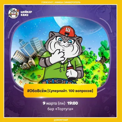 🤔 Шейкер квиз | ОбоВсём. Super Lite • 9 марта, 19:00 • Бар «Тортуга» • Кирова 54 Вас ждут 105 очень простых вопросов обо всём на свете на эрудицию, смекалку и логику. Задания проще, чем на #ОбоВсём