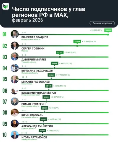 Мы продолжаем следить за динамикой роста каналов губернаторов в мессенджере MAX. По итогам февраля 2026 года общая аудитория глав регионов в MAX превысила 1,26 млн подписчиков и составила почти 1,265