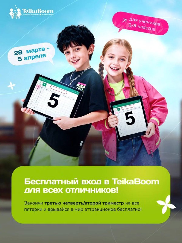 БЕСПЛАТНЫЙ билет в ТейкаБум для отличников 5⃣🎉 С 28 марта по 5 апреля все школьники 1–9 классов, которые закончили третью четверть или второй триместр на одни пятёрки, получают бесплатный билет в Т