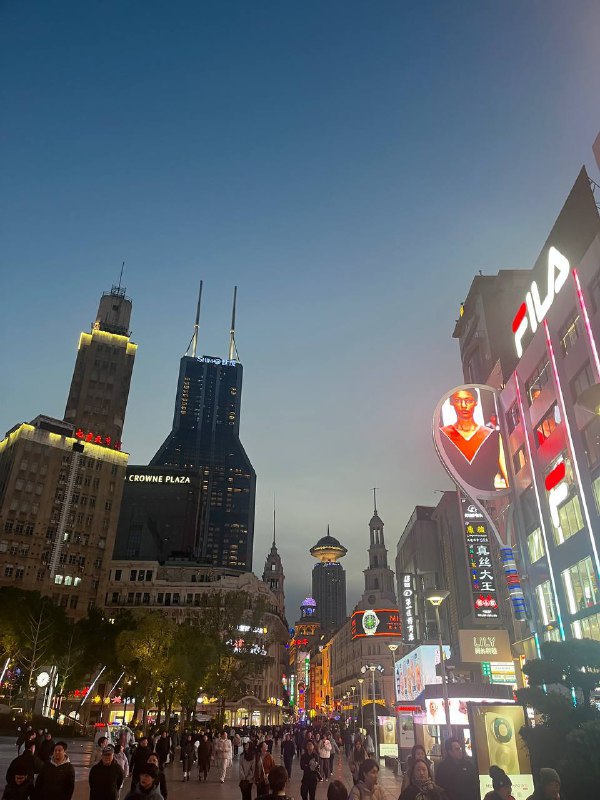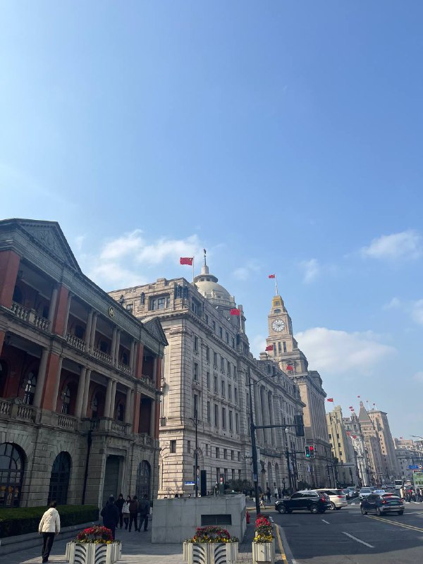 1. Набережная Вайтань (Бунд) у главной пешеходной Нанкинской улицы. Вид на Шанхайскую башню и вообще даунтаун на другой стороне реки Хуанпу. Шестиполосная оживлённая дорога. Середина дня. Красный свет