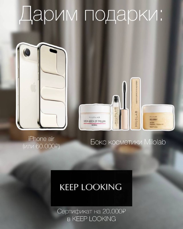 Дарим iPhone air (или 60.000₽), бокс косметики Milolab и сертификат в Keep looking + призы за актив. Условия участия: 1. Добавить к себе нашу ПАПКУ 2. Нажать кнопку «Участвую!» 1 место - iPhone ai