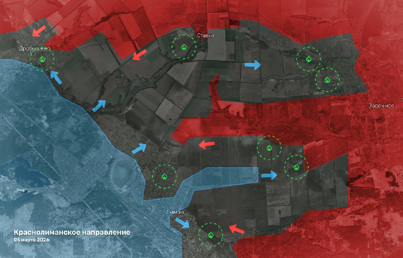 #Cводка по направлениям на 5 марта 2026 года. Краснолиманское направление. В районе Ставков и Дробышево расширилась серая зона, но устойчивых изменений ЛБС пока нет. Группы противника фиксируются н
