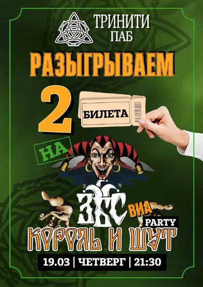 🎸 РОЗЫГРЫШ ДВУХ БИЛЕТОВ НА КОНЦЕРТ «Король и Шут» 🎸 Друзья, у нас отличные новости! 19 МАРТА В 21:30 «Король и Шут» снова звучит — и у тебя есть шанс попасть на концерт! Trinity Irish Pub разыг