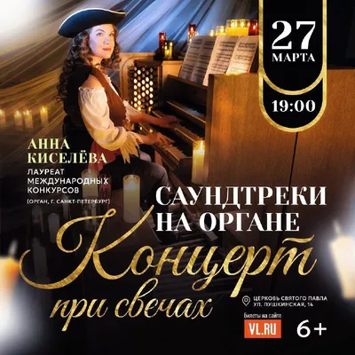 🎁🎁🌌ДАРИМ билеты на атмосефрный концерт при свечах «Саундтреки на органе»! Концерт пройдет 27 марта в 19:00, Церковь Св. Павла (ул. Пушкинская, 14) 🎹Петербургская органистка, лауреат международ