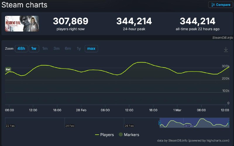 👀Resident Evil Requiem взлетела в Steam — 340+ тысяч игорьков онлайн Новая часть показала мощный старт: пиковый онлайн Resident Evil Requiem превысил 340 тысяч человек, благодаря чему игра обошла Mo