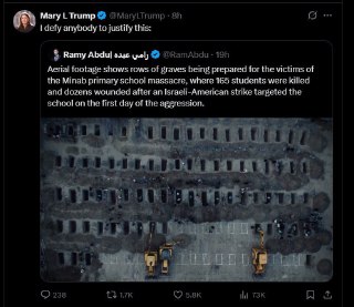 💬 Племянница Дональда Трампа осудила людей, оправдывающих удары США по Ирану. "Я ненавижу всех, кто пытается оправдать это", — написала Мэри Трамп в соцсети X, приложив фотографию кладбища с могил