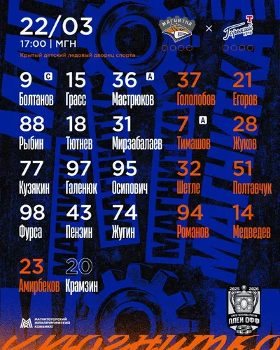 📋 Изучаем состав на первую игру первого раунда плей-офф 🥅 В воротах Джелал-ад-Дин Амирбеков, запасной Егор Крамзин 🏒 Капитан — Артур Болтанов, ассистенты — Николай Тимашов, Алексей Мастрюков Нач