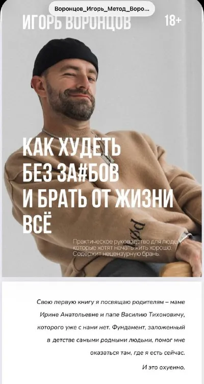 Здоровье и ФитнесРассказываю про похудение без подсчёта калорий, запретов, стресса и ебанутой долины (рпп), через работу с питанием, сном, кукухой и ресурсами человека. Ругаюсь матом 18+ Игорь Воронцов: @IgorVorontsov № 6636906506