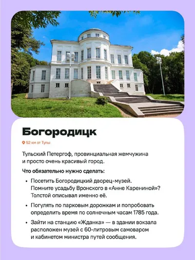 Тульская область изучена на 1% Слопали пряники, облазили Кремль и уже собираете чемоданы? Рано-рано. За пределами Тулы есть ещё 8 мест, куда стоит скататься. ❤️ — всем пока, я за белёвской пастилой