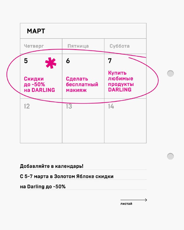 Начинаем предпраздничные дни DARLING*! В Золотом Яблоке тебя ждут скидки -50%. А при офлайн-покупке дарим: — тинт-лайнер NICE GESTURE при покупке от 2 000 ₽ — гель для душа CITOPIA при покупке от 3