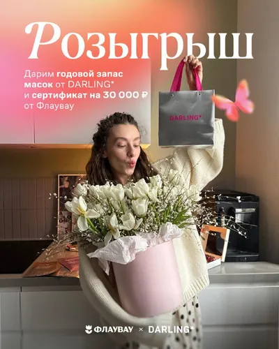 DARLING* x ФЛАУВАУ 💖 Объединились вместе, чтобы порадовать вас самыми весенними подарками Что подарим: Годовой запас масок DARLING* на каждый день, чтобы сиять Сертификат на 30 тысяч рублей во ФЛ