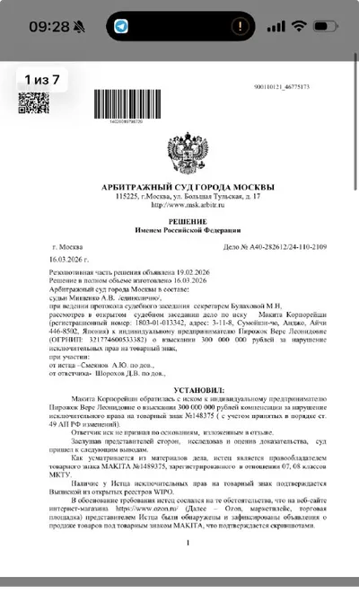 Истории нашего городка: Makita Corporation выиграла суд на 300 млн рублей у ИП Веры Пирожок из Удмуртии за то, что та продала на Ozon 38 781 паленый инструмент Makita. Пирожок, конечно, испекла дело
