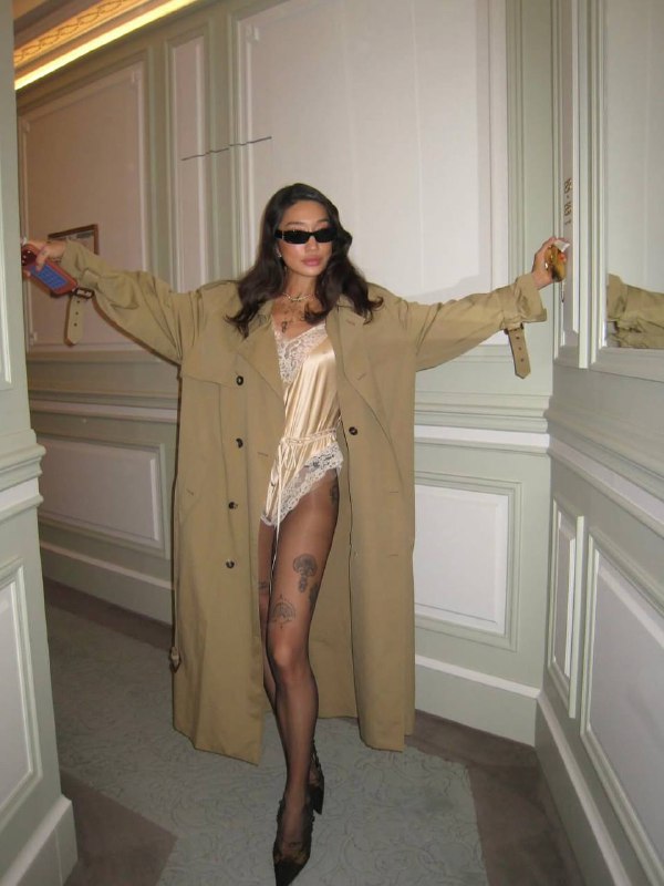 Наряд Пегги Гу с показа YSL в Париже как олицетворение мечты приехать к нему в плаще на голое тело. Только версия в сорочке. Обожаю её 😍