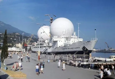 🗓 1970 год. Ялта, Крым, СССР 🚢 Научно-исследовательское судно «Космонавт Владимир Комаров» в ялтинском порту. 🔬 «Космонавт Владимир Комаров» был переоборудован из сухогруза «Геническ» и оснащён с