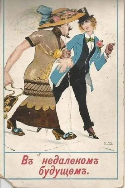История на открытках Начало 1917 года, Российская империя. Высмеивание в прогнозе на будущее тенденций эволюции женской одежды. На самом деле, революционные события (но несколько иного рода) и п