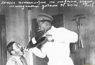 Лечение алкоголизма по новейшей, как тогда казалось, эффективной методике - лошадиными дозами касторового масла, 23 апреля 1916 года. Российская империя