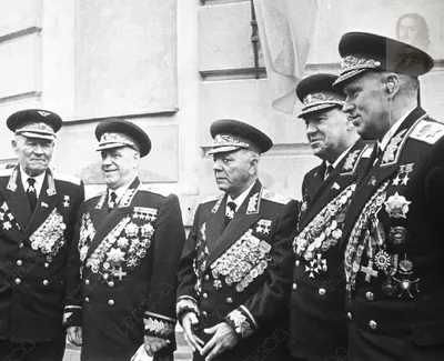 Маршалы Советского Союза в день 20 -летия Победы. Слева направо: Константин Андреевич Вершинин (1900 - 1973), Георгий Константинович Жуков (1896 - 1974), Климент Ефремович Ворошилов (1881 - 1969), Мат