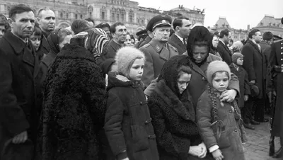 Супруга Юрия Гагарина Валентина Гагарина с дочерьми на похоронах Юрия Гагарина на Красной площади, 30 марта 1968 года