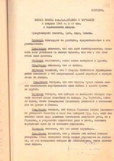 #ДокументНедели: Запись беседы И.В. Сталина с У. Черчиллем В ходе разговора, состоявшегося на полях Крымской конференции союзных держав, лидеры Советского Союза и Великобритании обсудили ход боевых д