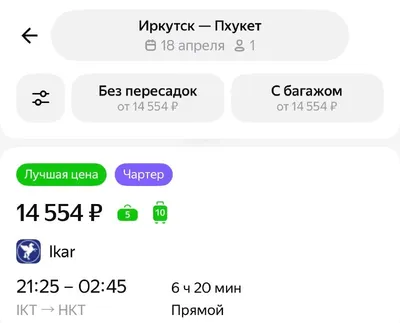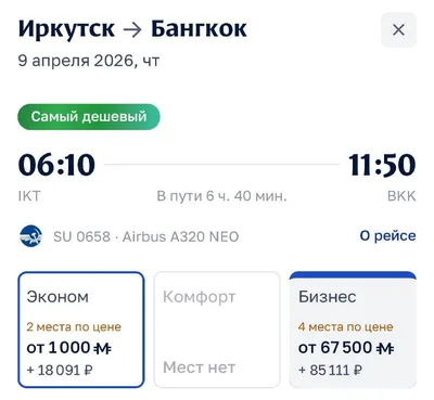 И для Иркутска пирожок есть 😉 https://aviasales.tpk.lv/Lacdw9PT Плюс не забываем про распродажу у Зеленых: 📍Пхукет - 35 400₽ (ноябрь-декабрь) https://aviasales.tpk.lv/xztixnvB 📍Бангкок - 28 800