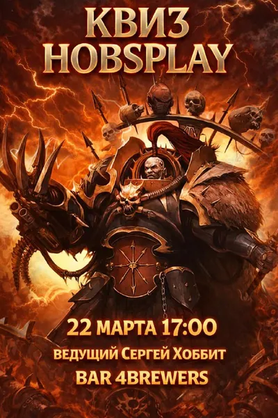Друзья, 22 Марта в 17:00 в баре 4brewers в Москве состоится НЕДУШНЫЙ квиз по Warhammer 40000 от канала Hobsplay! Наш квиз — командная интеллектуальная игра по вселенной Warhammer 40000. Ведущий кви