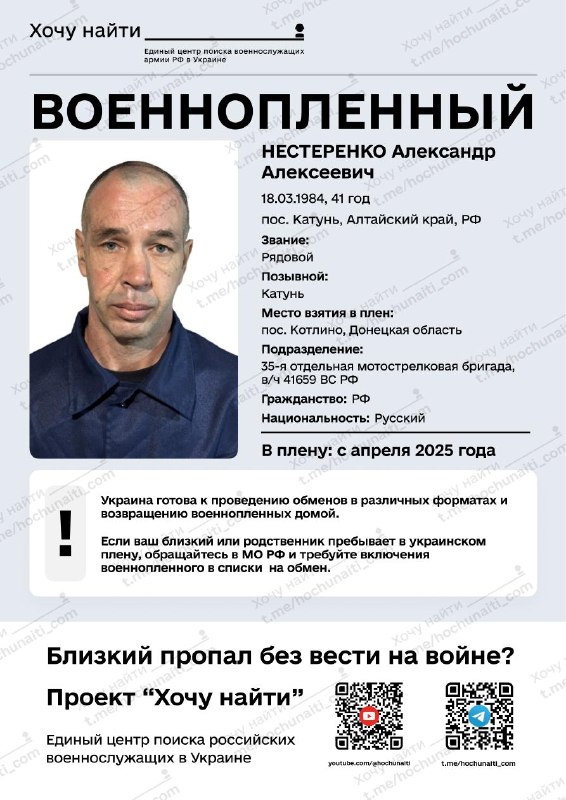 Новости и СМИОставить заявку на поиск @hochunaiti_bot "Хочу найти" – украинский государственный проект по предоставлению информации о военнопленных, пропавших без вести и погибших военнослужащих армии РФ в Украине Группа t.me/hochunaiti_chat Сайт hochunaiti.com
