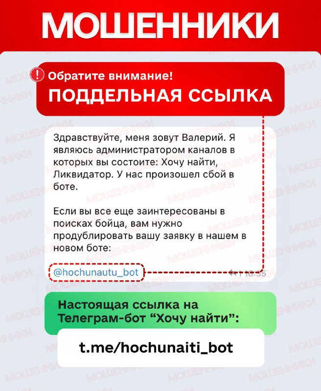 #мошенники ❗️ВНИМАНИЕ, МОШЕННИКИ! Часть 16: Мошенники шлют в личку поддельные ссылки чат-бота проекта “Хочу найти” Отмечены случаи, когда участникам сообщества проекта «Хочу найти» в «личку» пишут