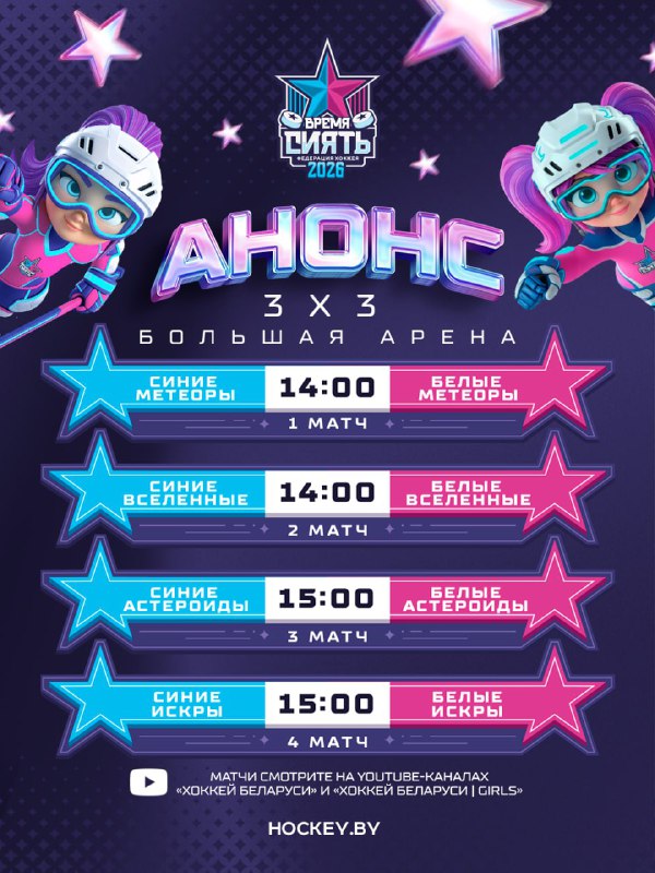 🥰🥰🥰 CЕГОДНЯ БУДЕТ КРАСИВО И ЯРКО! Всемирный женский матч на «Олимпик-Арене» Ловите расписание игр. Стартуем - в 14:00! 🤩 Матчи 3X3 и 5X5 покажем на YouTube-канале Хоккей Беларуси | Girls, а общу
