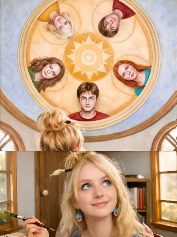 Потолок в комнате Полумны украшали пять замечательно выписанных лиц: Гарри, Рон, Гермиона, Джинни и Невилл. В отличие от хогвартских портретов, они не двигались, но все же какая-то магия в них была. Г