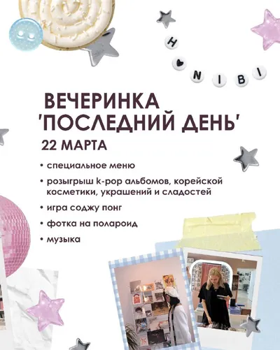 🤩🤩 ВЕЧЕРИНКА 🤩🤩'ПОСЛЕДНИЙ ДЕНЬ' 🤩🤩 22 марта 🖇️ специальное меню 🖇️ фото на полароид 🖇️ музыка 🖇️ игра соджу-понг : проверь свою меткость и выиграй рюмку соджу ~ 🖇️ РОЗЫГРЫШ k-pop альбомов