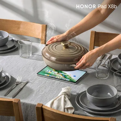 HONOR Pad X8b: надежность в ритме вашей жизни. Поиск рецептов или просмотр кино за завтраком — на кухне планшет всегда в центре событий. Как правило, одновременно нужно все нарезать, помыть посуду, в