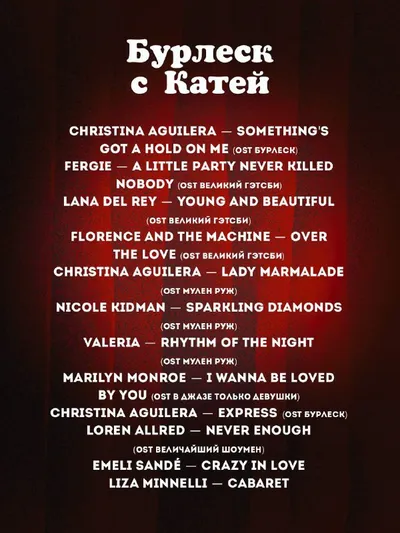 БУРЛЕСК ХОР 💃🏽 Добро пожаловать к нам в кабаре, где хрусталь люстр встречается с дымом, а под подушкой всегда найдется место для пистолета и помады. Этот плейлист — ночь в «Бурлеске», вечеринка у Гэ