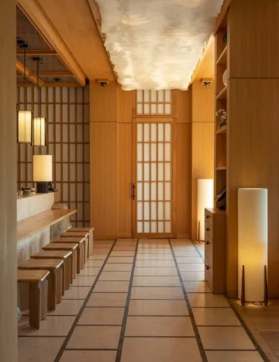 Ресторан Ryotei в парке Галицкого, на территории японского сада. В интерьерах по проекту rymar studio переосмысленная эстетика японского минимализма, из панорамных окон открывается вид на сад и озеро