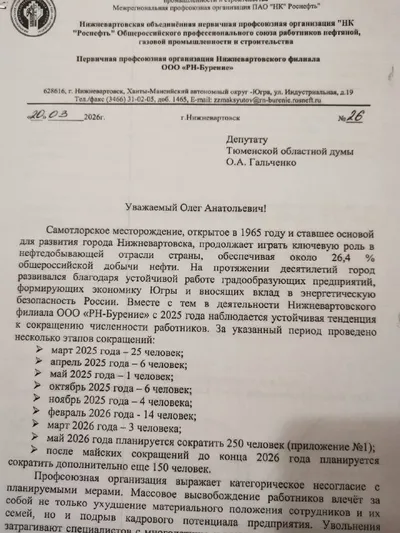 В дочерней структуре «Роснефти» в Нижневартовске планируются сокращения Профсоюз работников нефтесервисной компании «РН-Бурение» сообщил о предстоящих увольнениях и направил обращение региональным вл