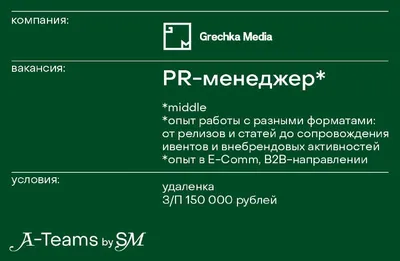 PR-менеджер в Grechka Media Удаленка, З/П 150 000 рублей Grechka Media — международное агентство полного цикла, специализирующееся на технологиях. Что нужно делать — Разрабатывать и реализовывать P