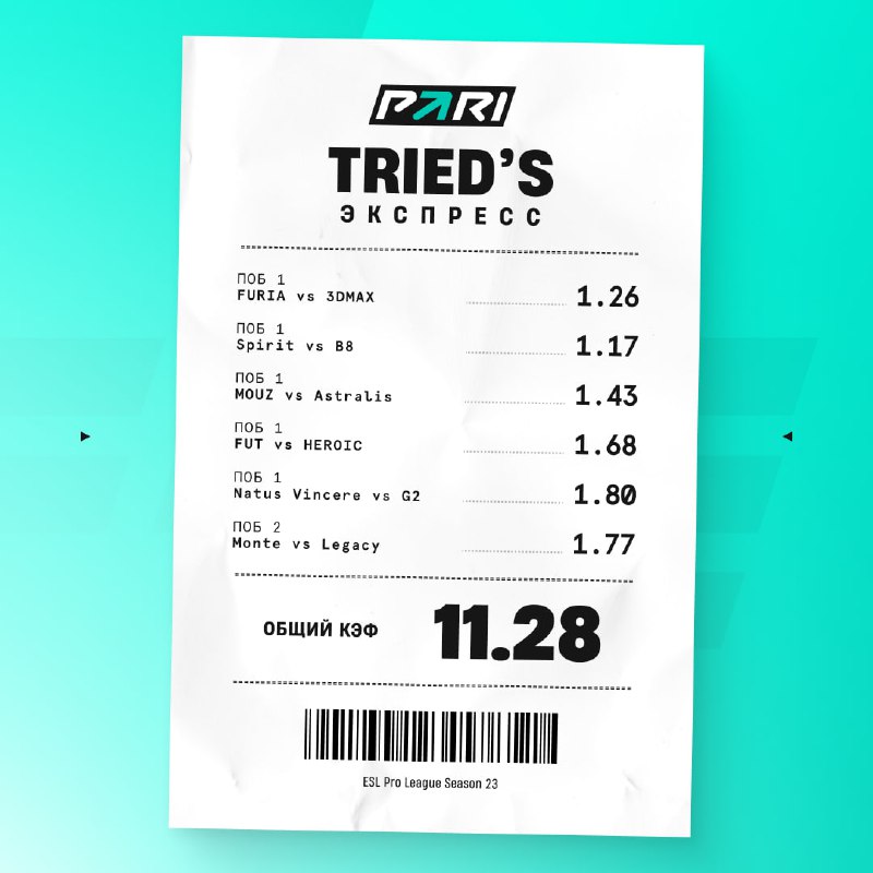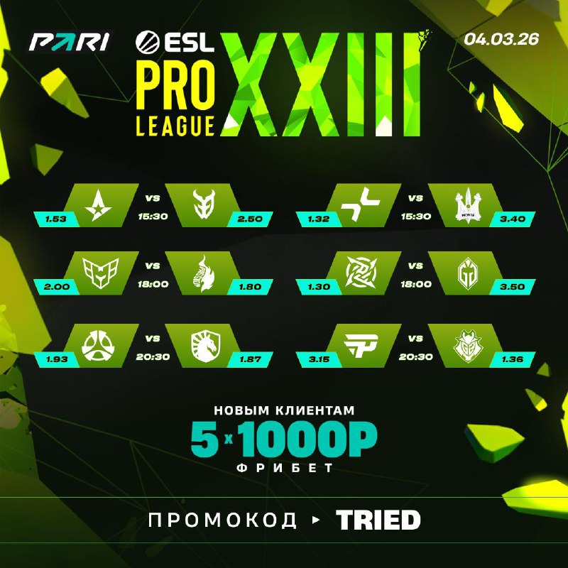 💥 ESL Pro League S23 в самом разгаре! 📌 Делай прогнозы на то, кто пройдет в play-off и лутай сочные кэфы вместе с PARI! 👉 Фрибет 5х1000 по промокоду TRIED
