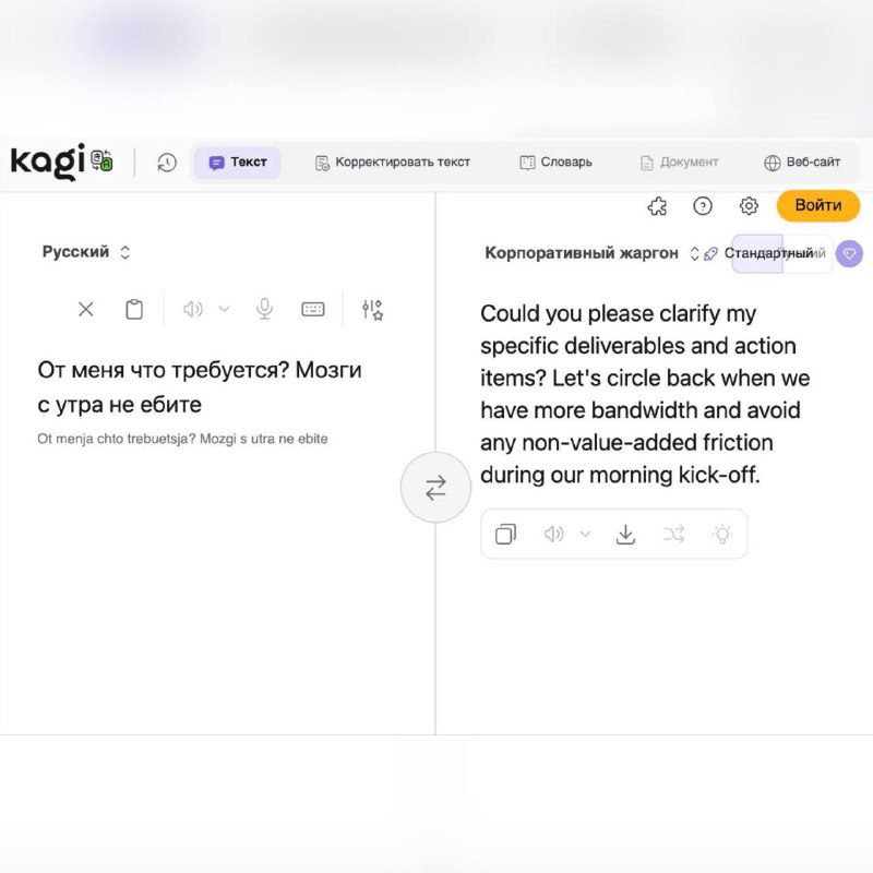 Вышел переводчик текста с человеческого на корпоративный - фича доступна в приложении Kagi. Теперь ИИ владеет не только русским, английским или французским языком, но и «Корпоративным жаргоном». Т