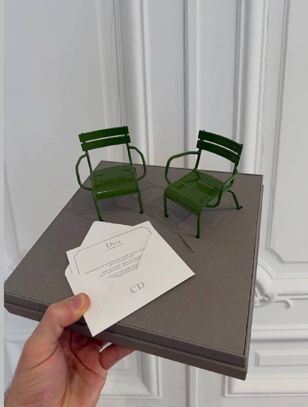Пригласительный на показ Dior🤍 Друзьям бренда прислали приглашение в виде мини-копий знаменитых парижских зеленых стульев, расположенных в Люксембургском саду.