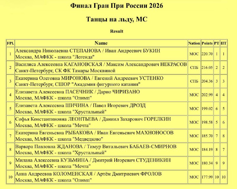 Александра Степанова и Иван Букин выиграли финал Гран-при России 🏆 🥇Александра Степанова/Иван Букин – 220.70 🥈Василиса Кагановская/Максим Некрасов – 216.05 🥉Екатерина Миронова/Евгений Устенко –
