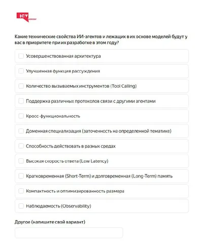 📊Опрос: какие технические свойства ИИ-агентов и лежащих в их основе моделей будут у вас в приоритете при их разработке в этом году? ICT.Moscow собирает мнения разработчиков о планах в области создан