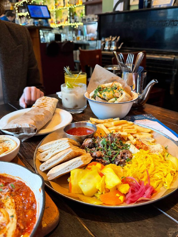 Вкусно и сытно на Рубинштейна – израильское бистро «Бекицер» Стрит-фуд бар, в который я хожу уже много лет. Мой фаворит в меню – огромная шварма на тарелке (670), микс из мяса, картофеля, овощей и х