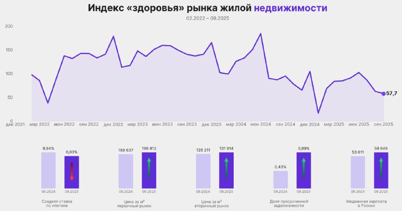 🏠 «Здоровье» рынка жилья в России просело почти вдвое с 2022 года Российский рынок недвижимости теряет «запас прочности». За период с февраля 2022 года по сентябрь 2025 уровень рассчитанного IF News