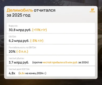 🚗 Отчет Делимобиля: есть свет в конце тоннеля Делимобиль опубликовал финансовые результаты за 2025 год. ➖ выручка: 30,8 млрд руб. (+11% г/г) ➖ EBITDA: 6,2 млрд руб. (-3% г/г) ➖ рентабельность по E