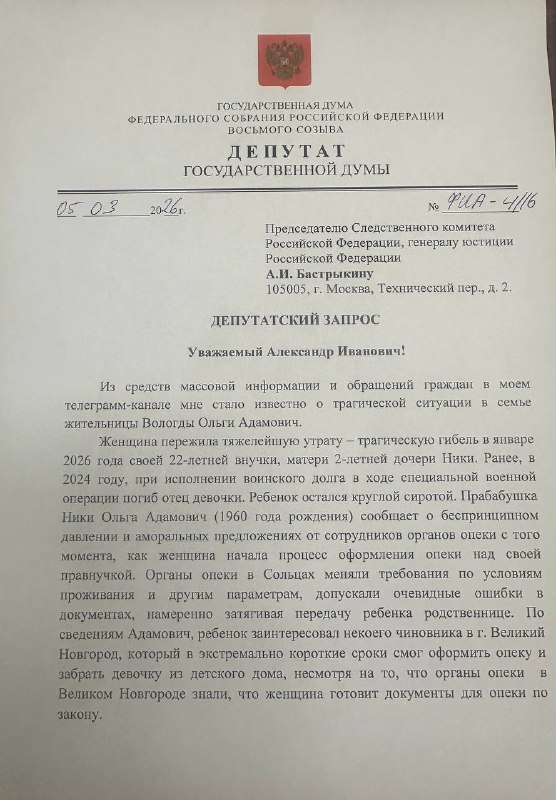 📲 До меня дошла резонансная информация о ситуации с Ольгой Адамович из Вологды, которую я не могу оставить без внимания. 👉 Пока прабабушка оформляла опеку в отношении оставшейся полной сиротой прав
