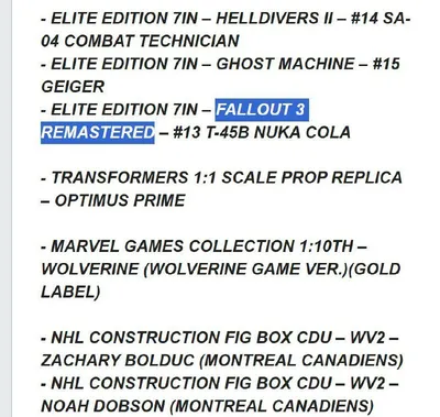 💦Сливчик Ремастер Fallout 3 был упомянут в официальном листинге производителя фигурок McFarlane Toys. Более того, пара игровых ритейлеров добавили игру в свои каталоги с ожидаемой датой релиза в июл